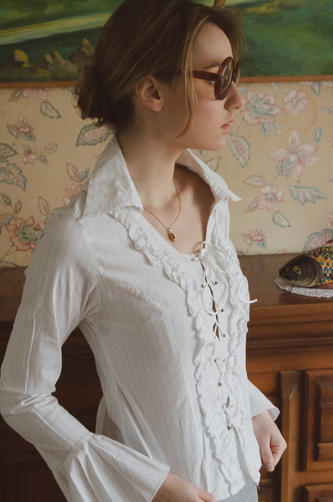 Chemise blanche à rayures noires en pointillés, laçage, manches volants, petits volants à l’avant